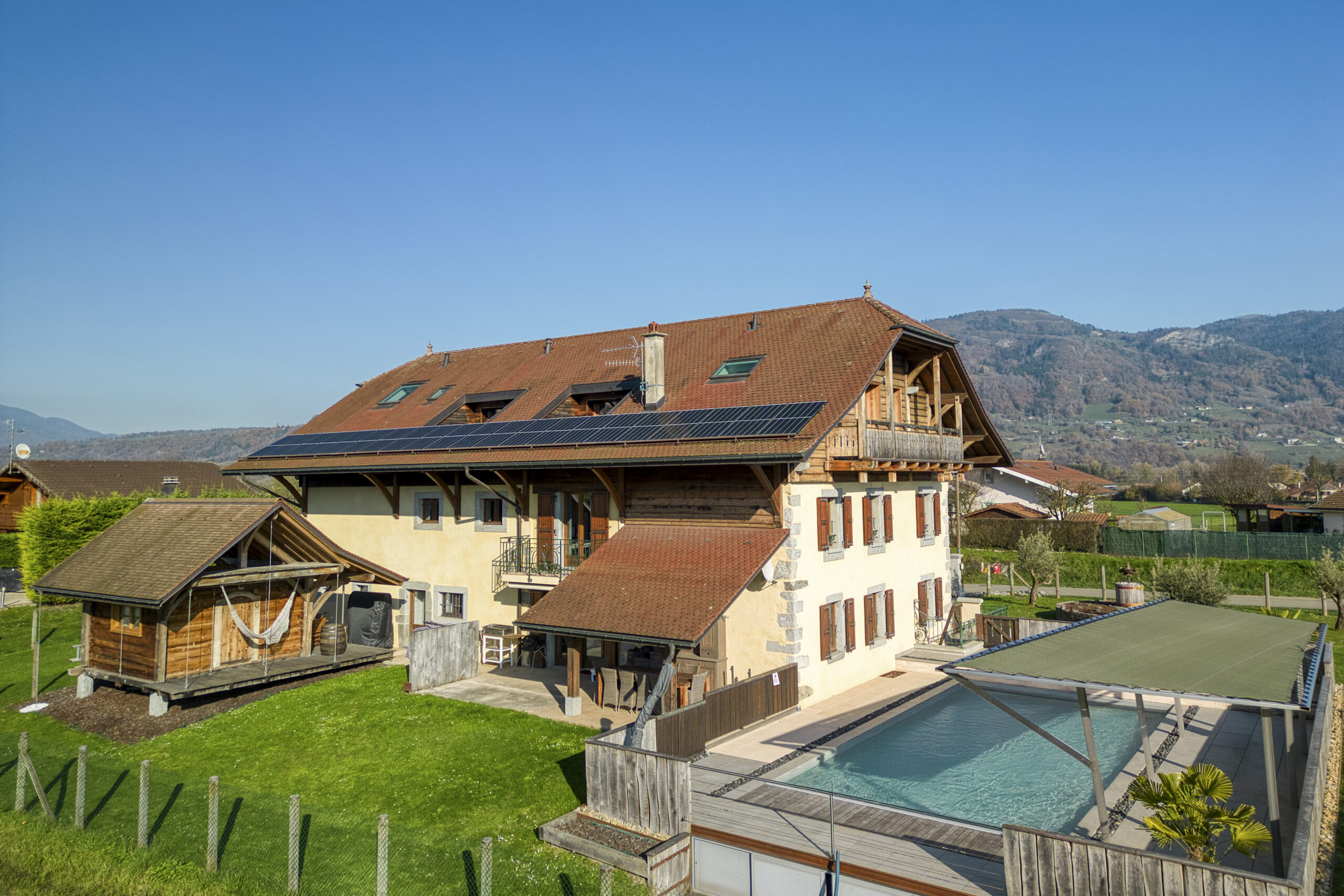 À seulement 30 minutes de Genève, au coeur du charmant village d’Arenthon, ce corps de ferme rénové datant 1905 vous propose un cadre de vie aussi paisible qu’élégant. Grâce à ses travaux réalisés avec soin, elle combine à merveille le cachet de l’ancien (boiseries, poutres, volumes généreux) et le confort de la modernité, grâce à des matériaux nobles et une rénovation de qualité. Construite sur un terrain plat et arboré de 1’818 m², avec une piscine chauffée et une vue dégagée sur les montagnes, la maison développe près de 400 m² habitables répartis sur trois niveaux.